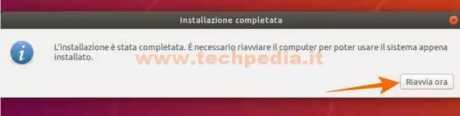 Attenzione, di solito quando clicchi su Riavvia ora il computer virtuale Ubuntu non si riavvia, perché bisogna rimuovere il disco di installazione. La prima volta ho aspettato circa 30 minuti prima di scorgere il messaggio.