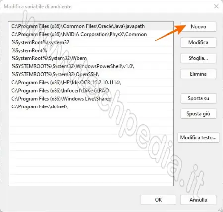 - Nel riquadro Variabili di sistema seleziona Path e clicca su Modifica