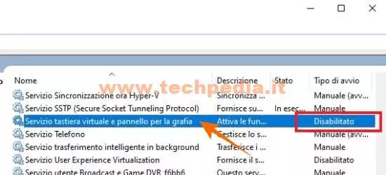 Scorri la lista dei servizi e individua Servizio tastiera virtuale e pannello per la grafia che dovrebbe essere Disabilitato. Fai un doppio clic sul servizio per aprire il pannello delle proprietà.
